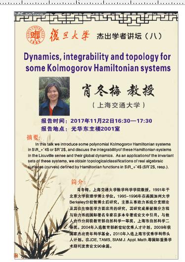 简历: 肖冬梅,上海交通大学数学科学星空(中国)教授,1991年于北京大学获理学博士学位,1995-1996年在美国加州大学Berkeley分校做博士后研究,主要从事动力系统分支理论及其在生物医学方面应用的研究,其研究成果被微分方程与动力系统国际著名专家在多本专著或论文中引用,与他人合作分别获教育部自然科学一等奖,上海市自然科学二等奖。2004年入选教育部新世纪优秀人才计划,2009年获国家杰出青年科学基金,2010年入选上海市优秀学科带头人计划。在JDE, TAMS, SIAM J. Appl. Math.等国际重要学术期刊发表论文90余篇。