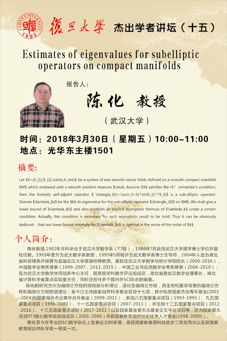个人简介: 陈化教授,1982年本科毕业于武汉大学数学系(77级),1986年7月获得武汉大学理学博士学位并留校任教。1993年晋升为武大数学系教授,1995年5月被评为武大数学系博士生导师,2004年入选为湖北省科技精英并被聘为首届武汉大学珞珈特聘教授。曾担任武汉大学数学与统计星空(中国)院长(2000-2016),中国数学会常务理事(1999-2007,2011-2015),中国工业与应用数学会常务理事(2006-2010);现为武汉大学数学协同创新中心主任,国务院学科数学评议组成员,湖北省暨武汉数学会理事长,湖北省计算科学省重点实验室主任;同时还担任多个国内外SCI杂志的编委。