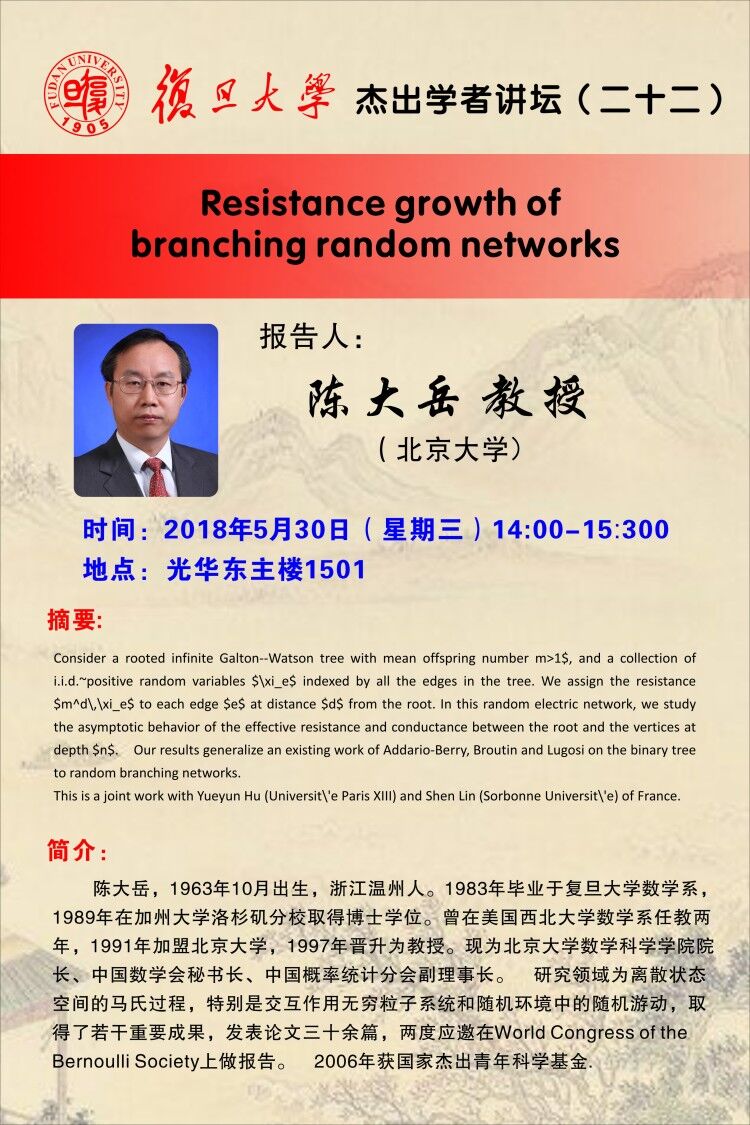 简介:陈大岳,1963年10月出生,浙江温州人。1983年毕业于复旦大学数学系,1989年在加州大学洛杉矶分校取得博士学位。曾在美国西北大学数学系任教两年,1991年加盟北京大学,1997年晋升为教授。现为北京大学数学科学星空(中国)院长、中国数学会秘书长、中国概率统计分会副理事长。研究领域为离散状态空间的马氏过程,特别是交互作用无穷粒子系统和随机环境中的随机游动,取得了若干重要成果,发表论文三十余篇,两度应邀在World Congress of the Bernoulli Society上做报告。2006年获国家杰出青年科学基金。