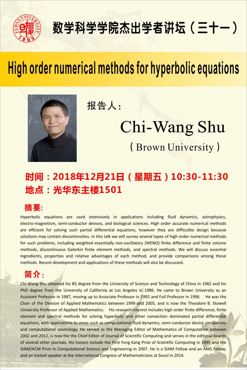 简介:Chi-Wang Shu obtained his BS degree from the University of Science and Technology of China in 1982 and his PhD degree from the University of California at Los Angeles in 1986. He came to Brown University as an Assistant Professor in 1987, moving up to Associate Professor in 1992 and Full Professor in 1996. He was the Chair of the Division of Applied Mathematics between 1999 and 2005, and is now the Theodore B. Stowell University Professor of Applied Mathematics. His research interest includes high order finite difference, finite element and spectral methods for solving hyperbolic and other convection dominated partial differential equations, with applications to areas such as computational fluid dynamics, semi-conductor device simulations and computational cosmology. He served as the Managing Editor of Mathematics of Computation between 2002 and 2012, is now the the Chief Editor of Journal of Scientific Computing and serves in the editorial boards of several other journals. His honors include the First Feng Kang Prize of Scientific Computing in 1995 and the SIAM/ACM Prize in Computational Science and Engineering in 2007. He is a SIAM Fellow and an AMS Fellow, and an invited speaker at the International Congress of Mathematicians at Seoul in 2014.