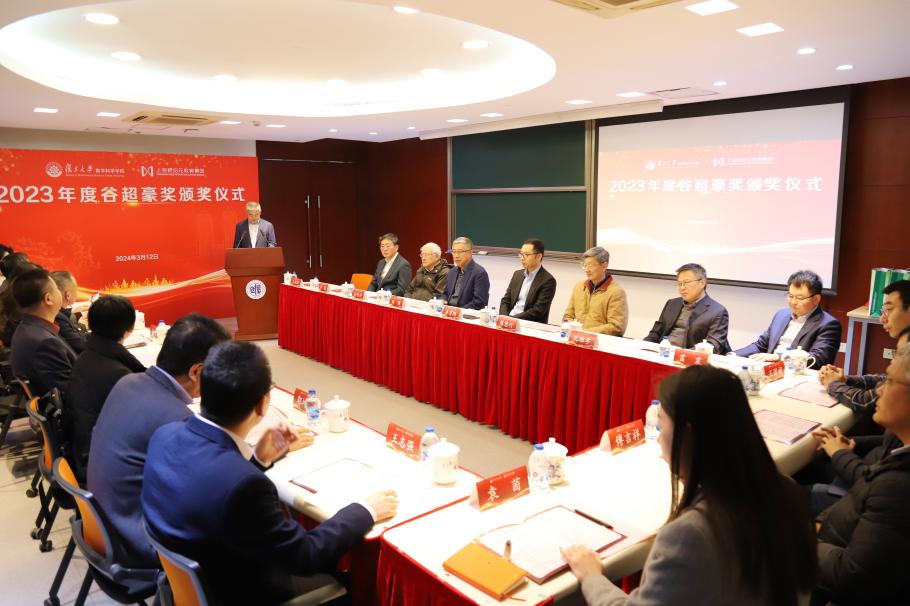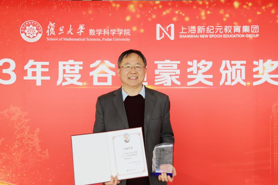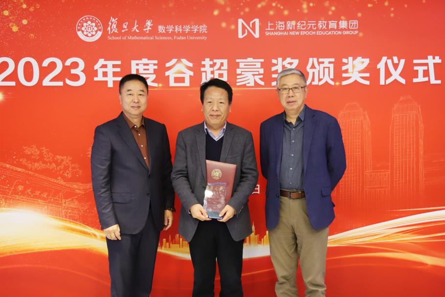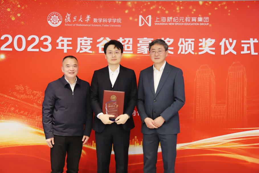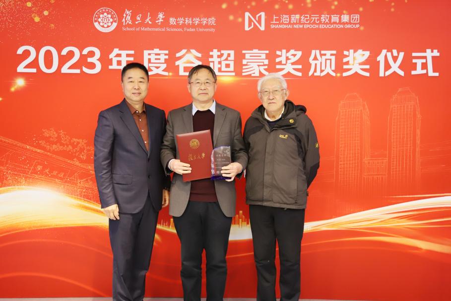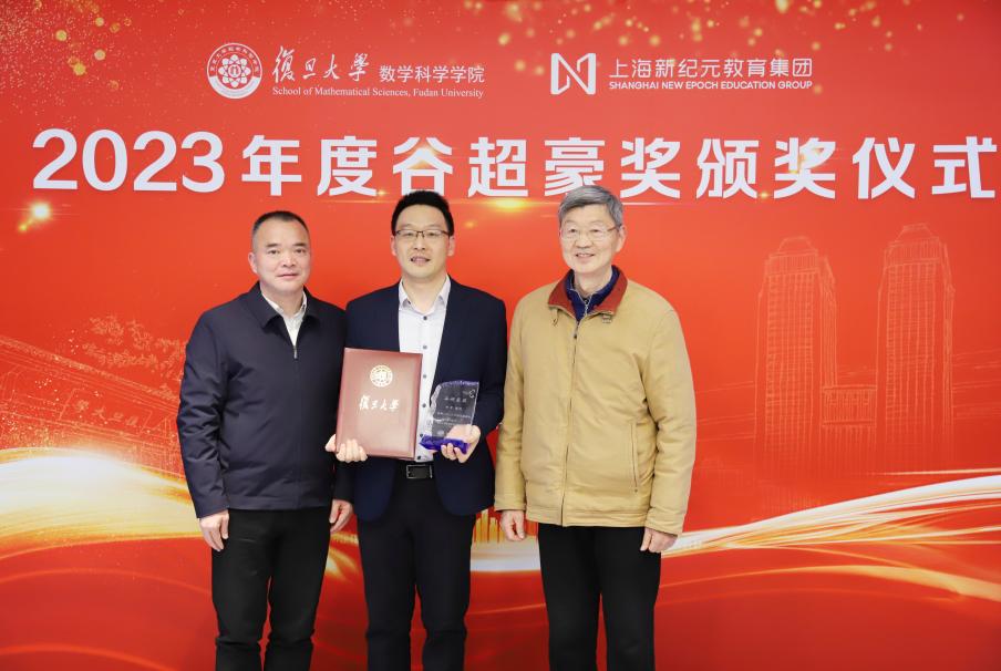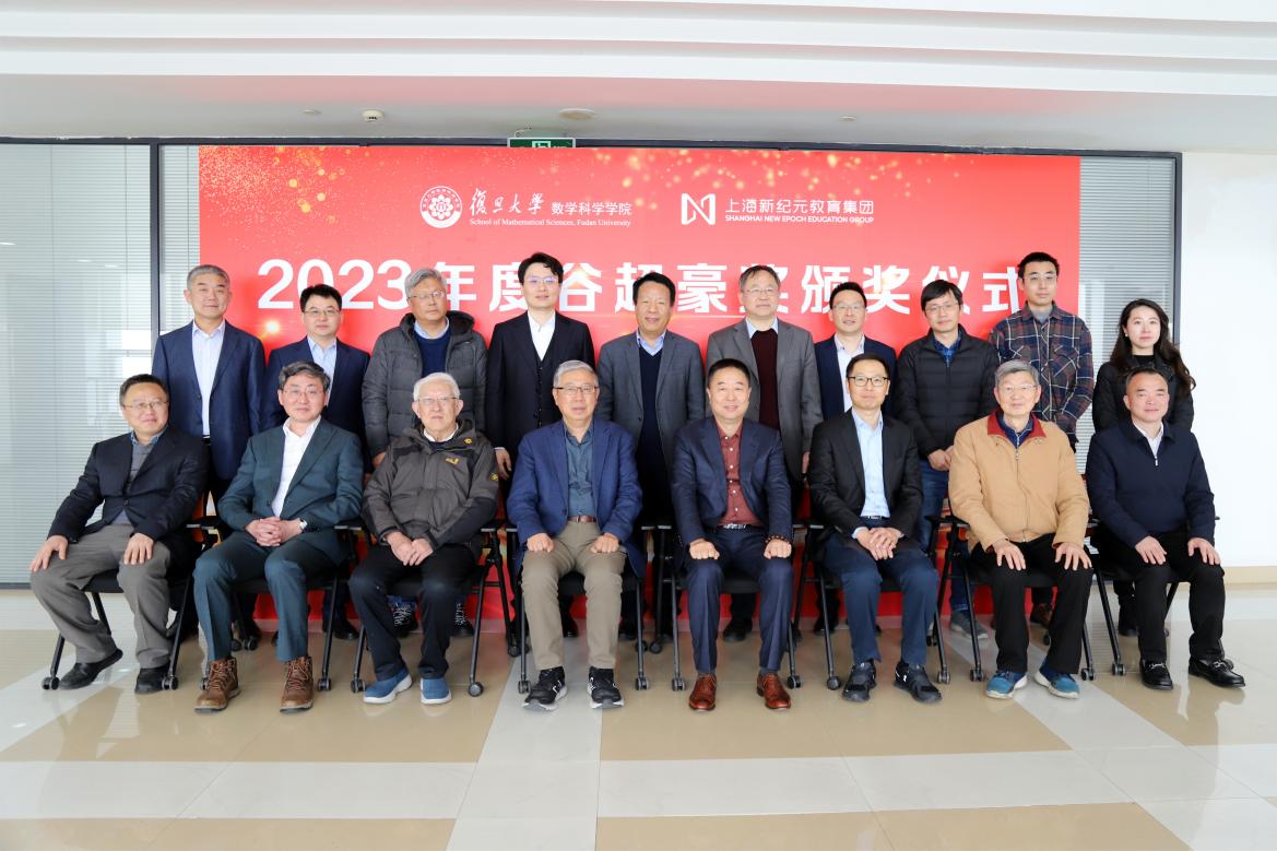 3月12日下午, 2023年度“谷超豪奖”颁奖仪式在光华楼东主楼2201会议室举行。上海新纪元教育集团董事长陈伟志、总裁办主任陈豆豆、上海新纪元公益基金会专员袁茵,北京国际数学研究中心主任、国家基金委数学天元基金学术领导小组组长、北京大学田刚院士,温州市人民政府驻上海联络处主任徐清雨、协作处副处长林捷,复旦大学副校长姜育刚,数学科学星空(中国)洪家兴院士、陈恕行院士,上海数学中心主任李骏院士,上海数学中心副主任、数学科学星空(中国)副院长沈维孝院士,数学科学星空(中国)院长雷震,以及往届“谷超豪奖”获奖者代表等参加了颁奖仪式。数学科学星空(中国)党委书记王光临主持颁奖仪式。