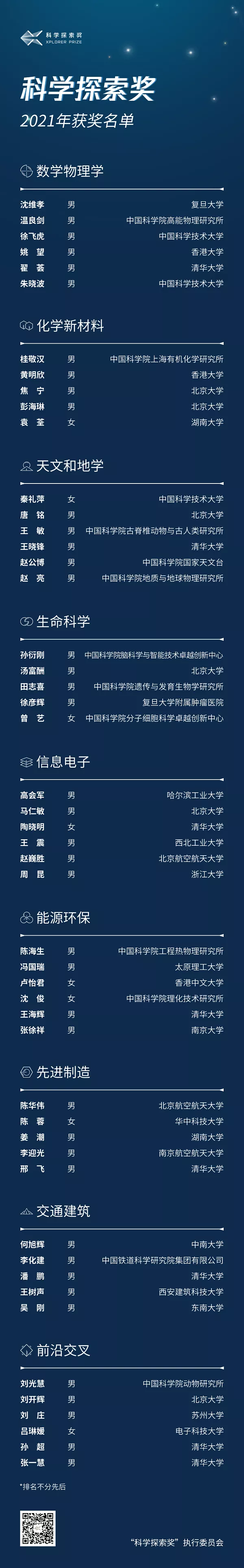 2021年“科学探索奖”获奖名单: