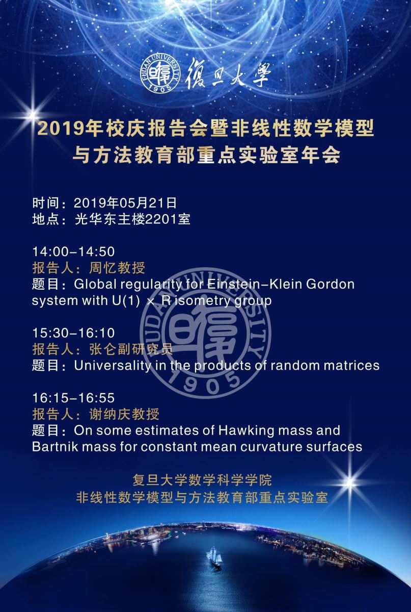 会议日程 14:00-14:50 报告人:周 忆 教授 题 目:Global regularity for Einstein-Klein Gordon system with U(1)× R isometry group 15:30-16:10 报告人:张 仑 副研究员 题 目:Universality in the products of random matrices 16:15-16:55 报告人:谢纳庆 教授 题 目:On some estimates of Hawking mass and Bartnik mass for constant mean curvature surfaces 海报 |