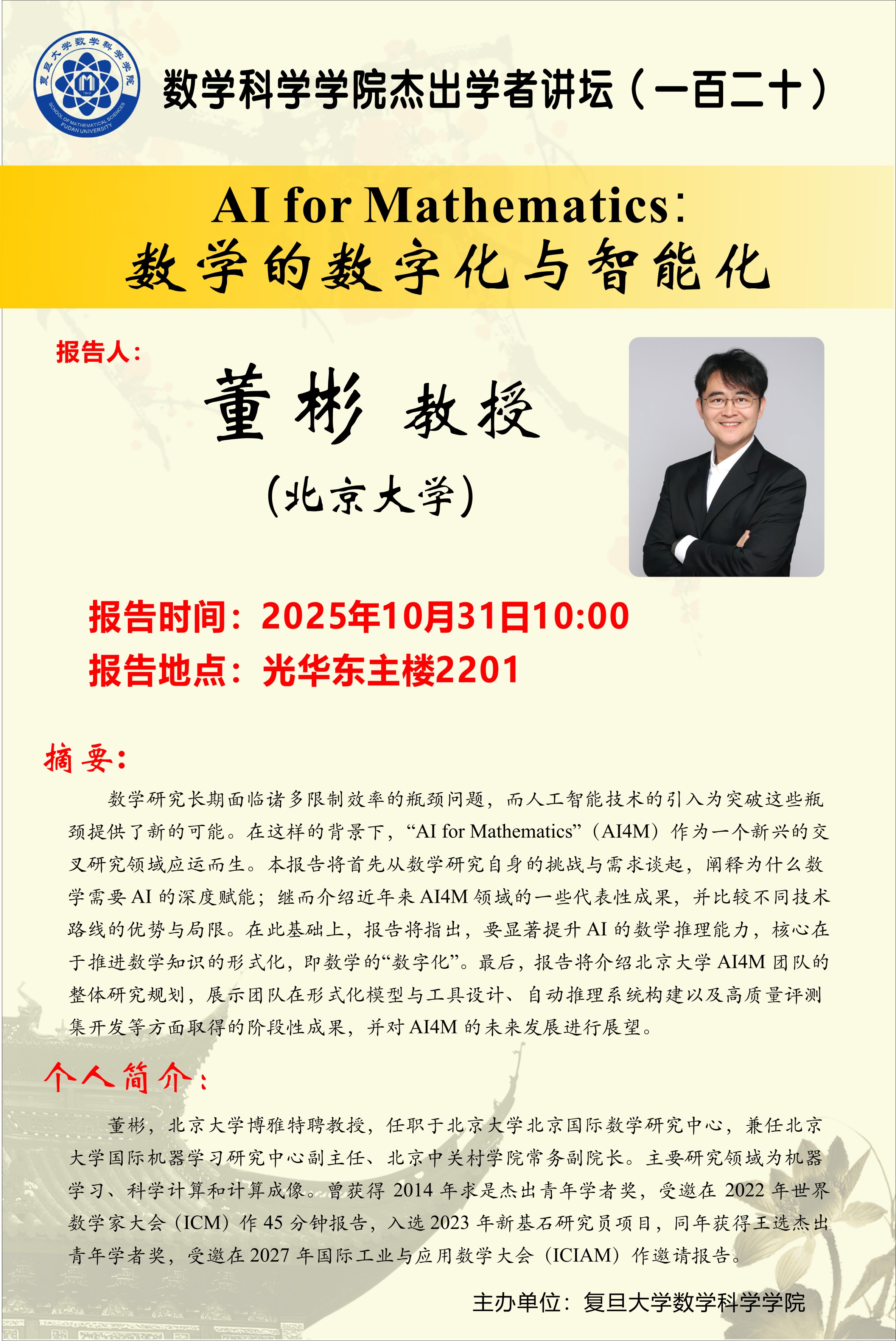 数学研究长期面临诸多限制效率的瓶颈问题,而人工智能技术的引入为突破这些瓶颈提供了新的可能。在这样的背景下,“AI for Mathematics”(AI4M)作为一个新兴的交叉研究领域应运而生。本报告将首先从数学研究自身的挑战与需求谈起,阐释为什么数学需要AI的深度赋能;继而介绍近年来AI4M领域的一些代表性成果,并比较不同技术路线的优势与局限。在此基础上,报告将指出,要显著提升AI的数学推理能力,核心在于推进数学知识的形式化,即数学的“数字化”。最后,报告将介绍北京大学AI4M团队的整体研究规划,展示团队在形式化模型与工具设计、自动推理系统构建以及高质量评测集开发等方面取得的阶段性成果,并对AI4M的未来发展进行展望。