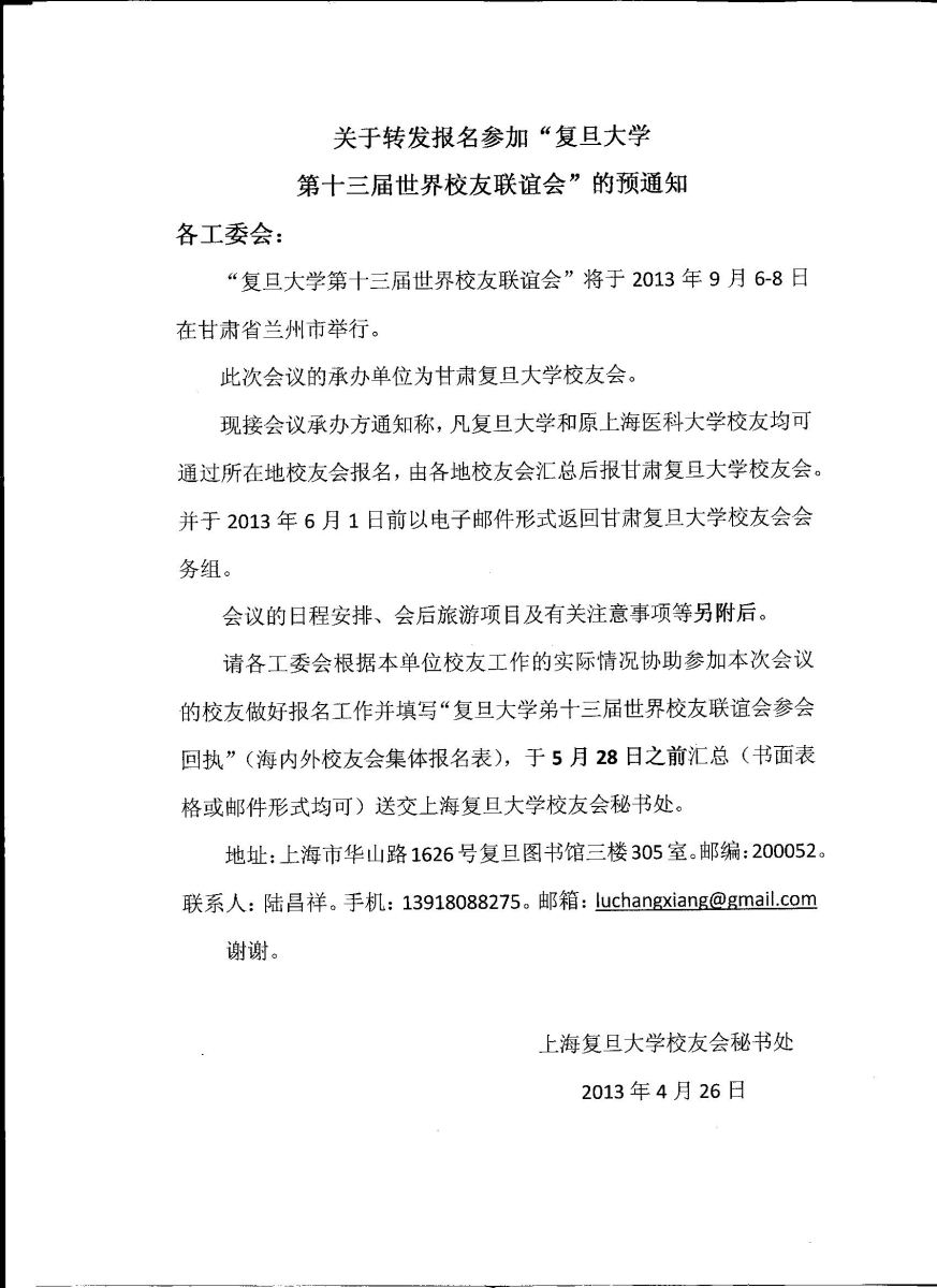 关于转发报名参加“复旦大学第十三届世界校友联谊会”的预通知