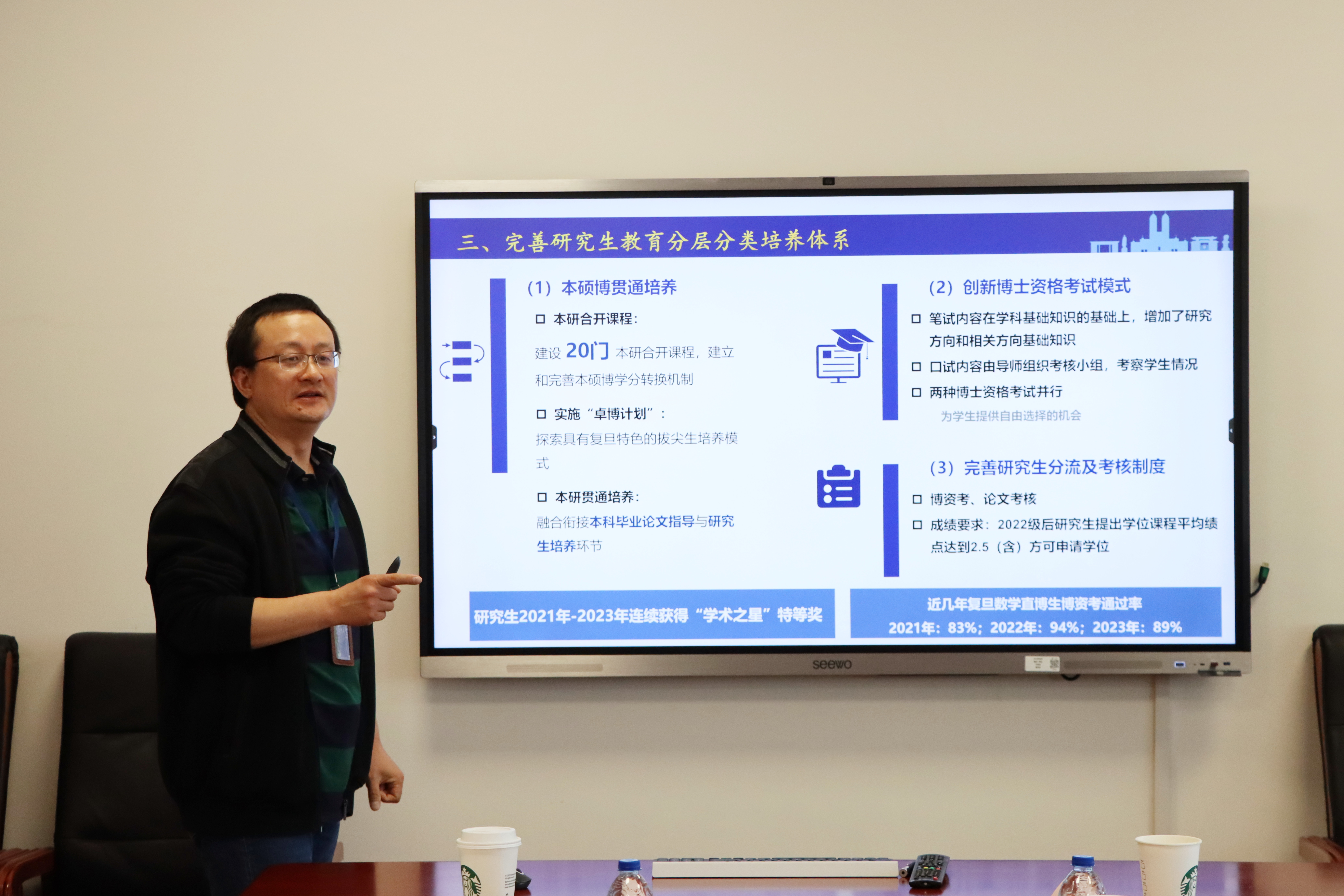 数学科学星空(中国)副院长陆帅主要从招生改革举措、培养举措两个方面详细介绍了数学学科研究生培养情况,指出学科高水平建设高层次人才中心,推进培养体系、课程体系等方面多项改革举措,不断深化研究生拔尖创新人才培养力度。