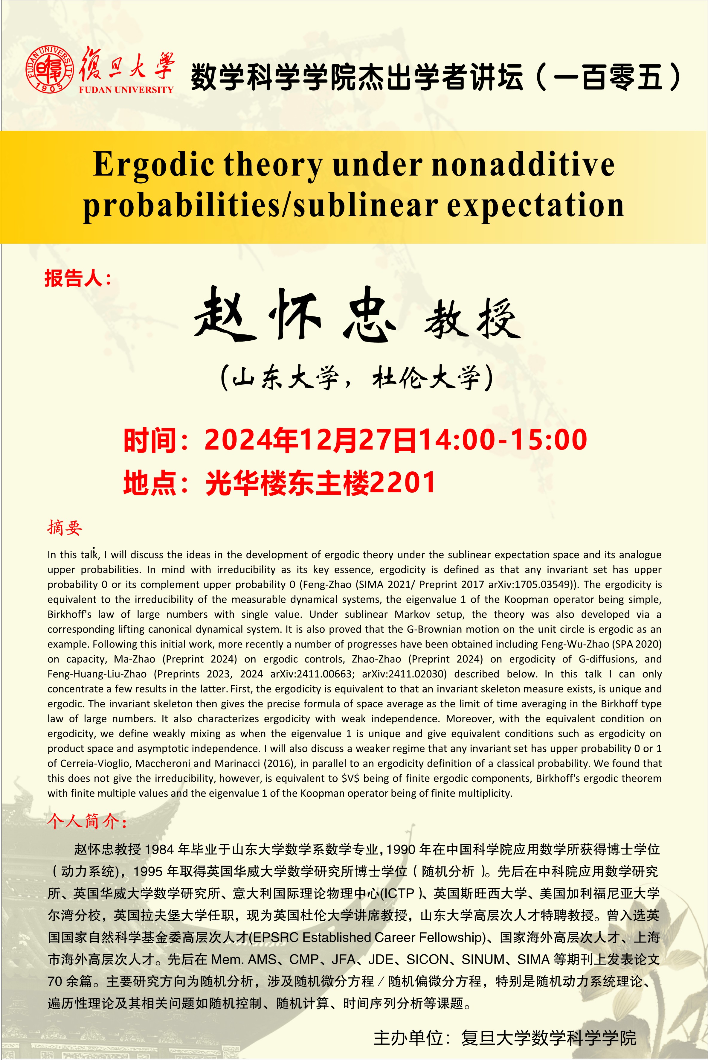 In this talk, I will discuss the ideas in the development of ergodic theory under the sublinear expectation space and its analogue upper probabilities. In mind with irreducibility as its key essence, ergodicity is defined as that any invariant set has upper probability 0 or its complement upper probability 0 (Feng-Zhao (SIMA 2021/ Preprint 2017 arXiv:1705.03549)). The ergodicity is equivalent to the irreducibility of the measurable dynamical systems, the eigenvalue 1 of the Koopman operator being simple, Birkhoff's law of large numbers with single value. Under sublinear Markov setup, the theory was also developed via a corresponding lifting canonical dynamical system. It is also proved that the G-Brownian motion on the unit circle is ergodic as an example. Following this initial work, more recently a number of progresses have been obtained including Feng-Wu-Zhao (SPA 2020) on capacity, Ma-Zhao (Preprint 2024) on ergodic controls, Zhao-Zhao (Preprint 2024) on ergodicity of G-diffusions, and Feng-Huang-Liu-Zhao (Preprints 2023, 2024 arXiv:2411.00663; arXiv:2411.02030) described below. In this talk I can only concentrate a few results in the latter. First, the ergodicity is equivalent to that an invariant skeleton measure exists, is unique and ergodic. The invariant skeleton then gives the precise formula of space average as the limit of time averaging in the Birkhoff type law of large numbers. It also characterizes ergodicity with weak independence. Moreover, with the equivalent condition on ergodicity, we define weakly mixing as when the eigenvalue 1 is unique and give equivalent conditions such as ergodicity on product space and asymptotic independence. I will also discuss a weaker regime that any invariant set has upper probability 0 or 1 of Cerreia-Vioglio, Maccheroni and Marinacci (2016), in parallel to an ergodicity definition of a classical probability. We found that this does not give the irreducibility, however, is equivalent to $V$ being of finite ergodic components, Birkhoff's ergodic theorem with finite multiple values and the eigenvalue 1 of the Koopman operator being of finite multiplicity.