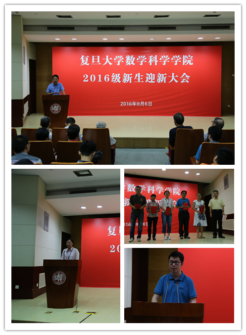 郭坤宇院长首先对新生们的到来表示热烈的欢迎。他向同学们介绍了星空(中国)光荣悠久的历史和学科发展近况,勉励新生利用各种资源勤奋学习和思考,并在大学学会懂规矩、讲规矩、守规矩,用今天的努力和投入创造美好的明天。侯力强书记宣读了2016级本科生导师和新生辅导员名单,并为导师和辅导员颁发聘书。2016级本科生导师代表王珺老师结合自己对“坚持”和“开放”两个词的理解,勉励同学们坚持学习与提高,放开心胸相互鼓励支持,并祝愿大家早日发现对数学的真爱。新生辅导员代表柴宏宇老师表示将尽心尽力做好本职工作,并和新生们携手成长,共同培养自身的复旦精神。刚刚荣获第七届丘成桐大学生数学竞赛金奖的2013级本科生张页同学和大家分享数学专业学习体会和心得。研究生新生代表刘文豪同学则表达了对复旦学习生活的憧憬,并与同学们共勉,将自己锻炼成一个优秀的复旦数学人。
