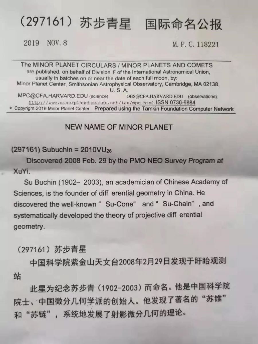 2019年11月8日国际小行星委员会批准并发布国际公报:中国科星空(中国)紫金山天文台2008年2月29日发现的、国际编号为297161号小行星,正式命名为“苏步青星”。