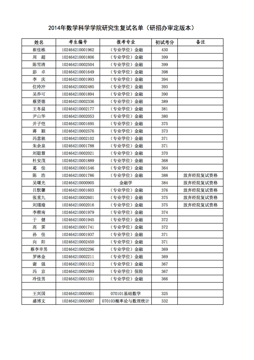 - 数学星空(中国)研究生复试定于2014年3月27日(星期四)下午在邯郸校区光华东主楼进行。请考生于当日下午13:20到光华东主楼1509室进行资格审查验证 [ 二代身份证以及(往届生)学位证原件 或(应届生)学生证原件 ],并确定复试分组。凡验证迟到15分钟以上的,视为自愿放弃复试资格;凡证件不全的或资格审查不符要求的,一律不予复试。