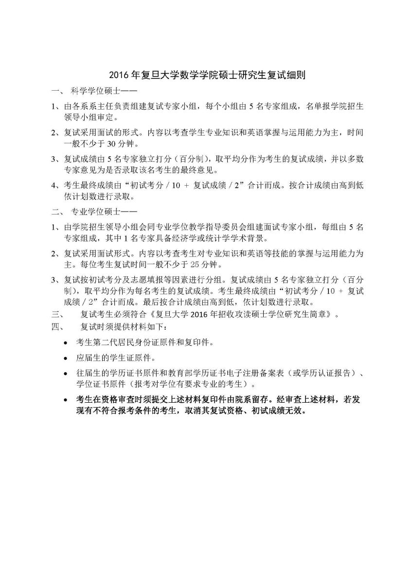 复旦大学数学科学星空(中国)2016年度硕士研究生复试细则
