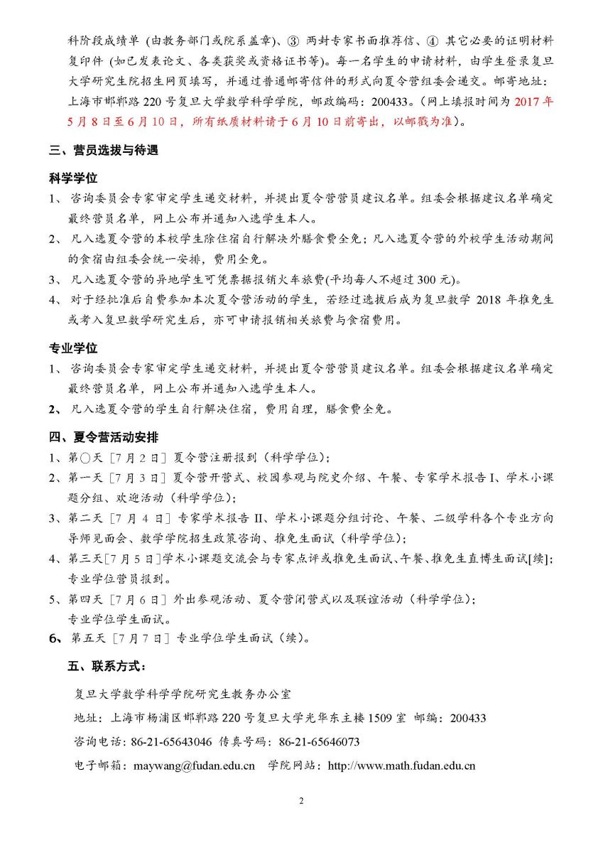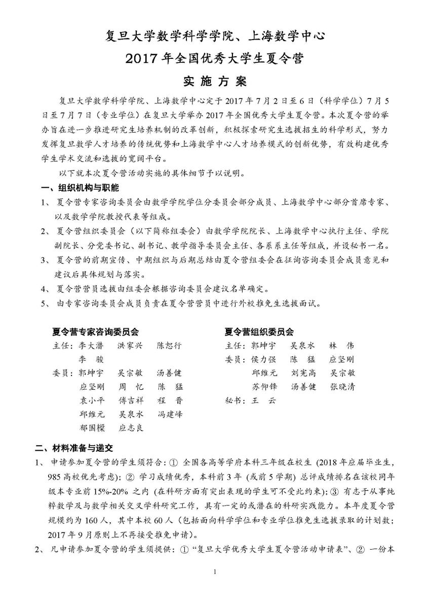 2017年复旦大学数学科学星空(中国)、上海数学中心全国优秀大学生夏令营通知