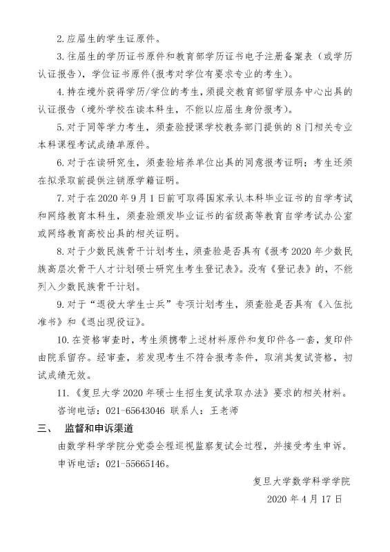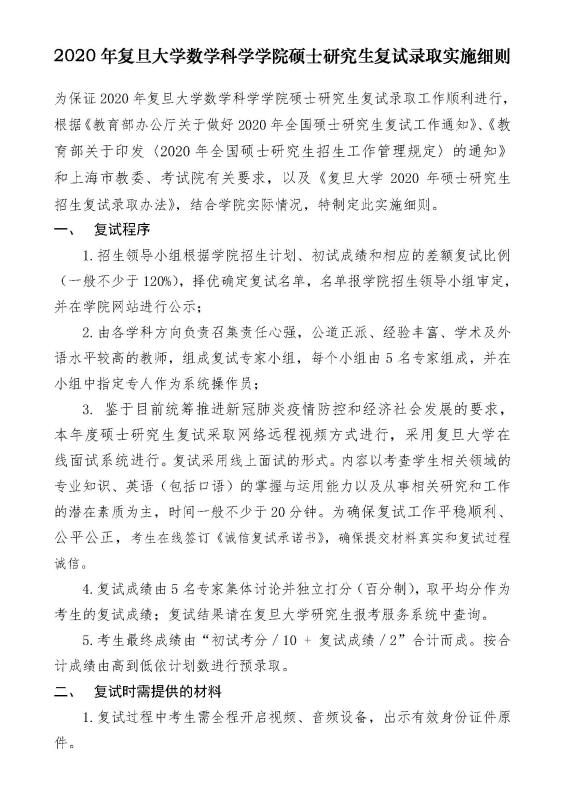 2020年复旦大学数学科学星空(中国)硕士研究生复试录取实施细则