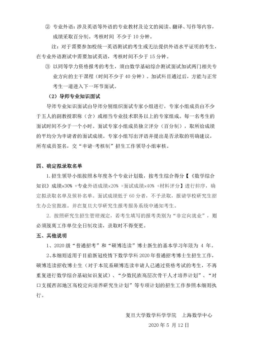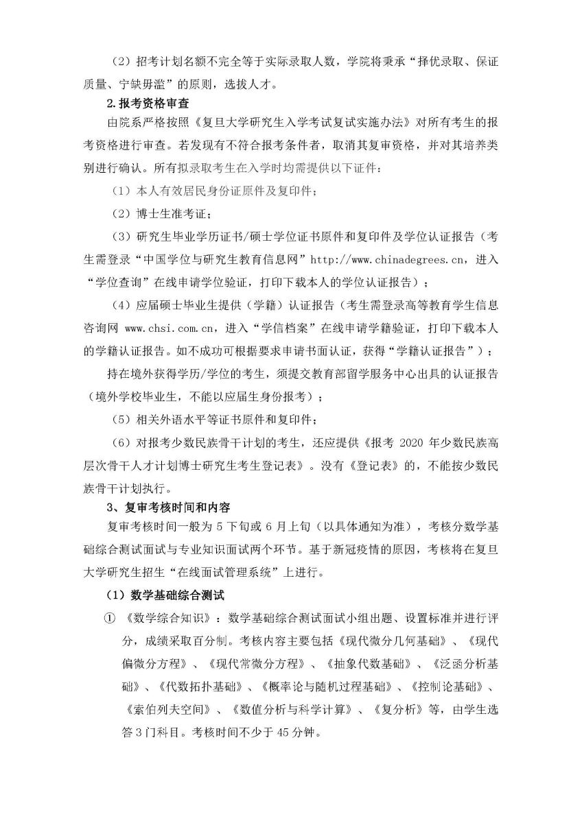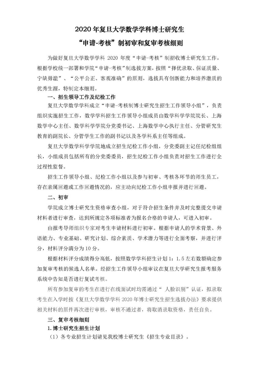 2020年复旦大学数学科学学科博士研究生“申请-考核”制初审和复审考核细则