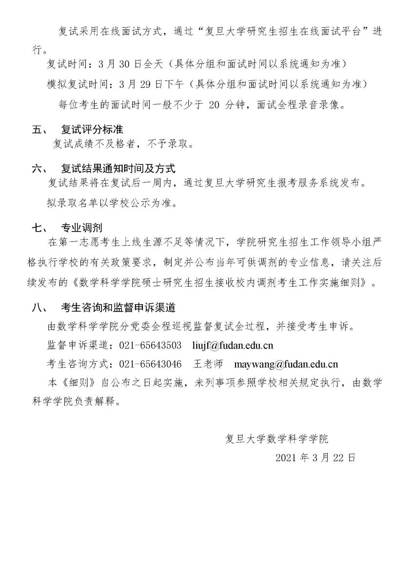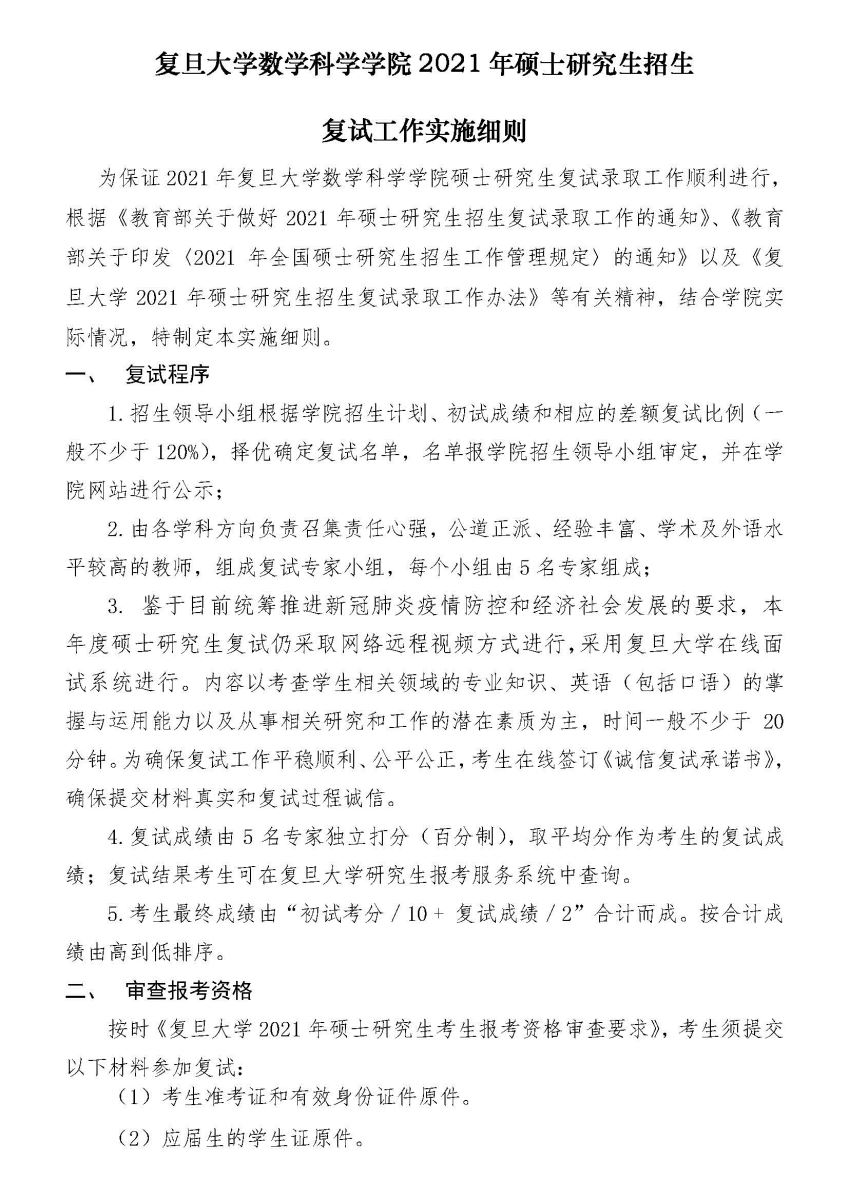复旦大学数学科学星空(中国)2021年硕士研究生招生复试工作实施细则