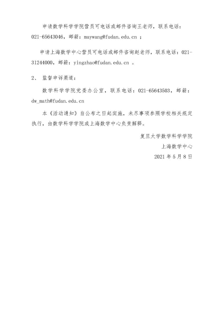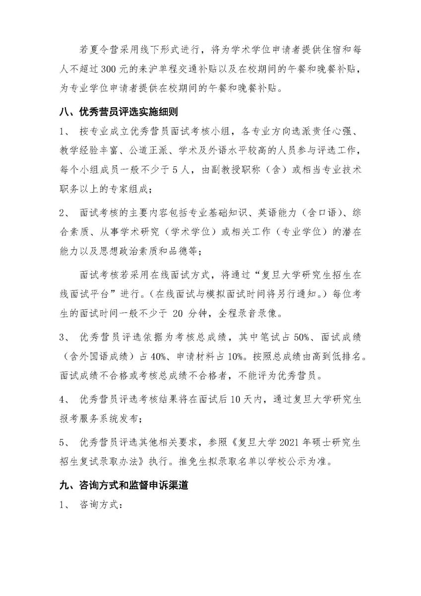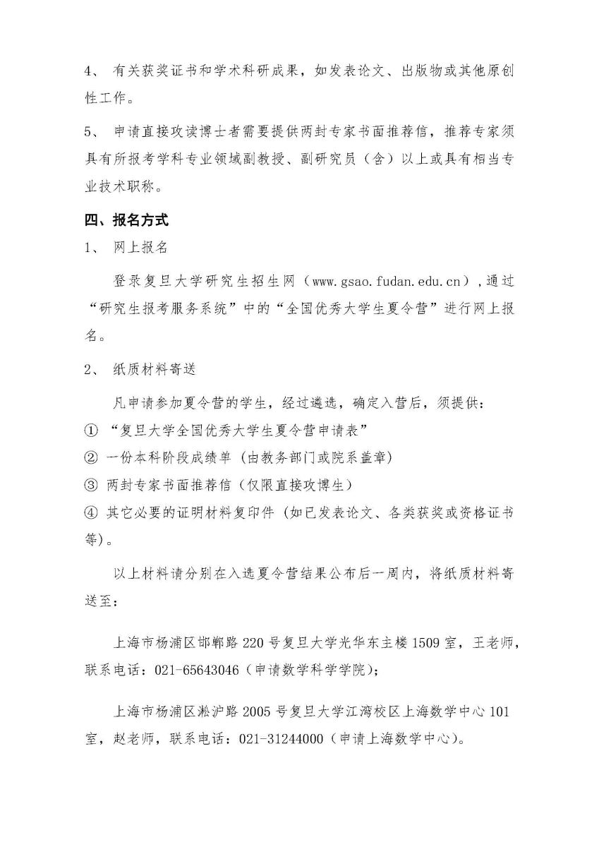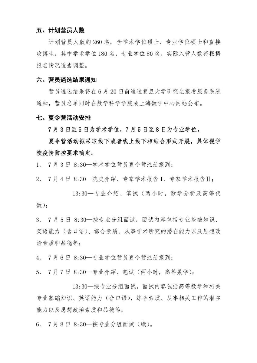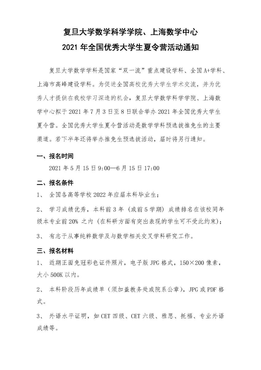 复旦大学数学学科2021年全国优秀大学生夏令营通知