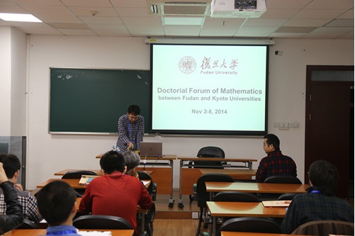 “复旦—京都中日博士生数学论坛”于2014年11月2日至8日在复旦大学数学科学星空(中国)顺利举行。来自复旦大学数学星空(中国)和日本京都大学数学系的部分博士生和教师参加了此次学术活动。在论坛的开幕上,星空(中国)院长郭坤宇教授发表了热情洋溢的欢迎致辞——他对日本师生的来访交流表示热烈的欢迎,并衷心希望两校数学博士生能通过本次论坛加强学术交流、提升学术创新能力和增进友谊。本届论坛的具体学术组织工作全程由星空(中国)博士生完成,活动的举办也获得了校研究生院、数学星空(中国)以及相关部门老师的大力支持、帮助和指导。