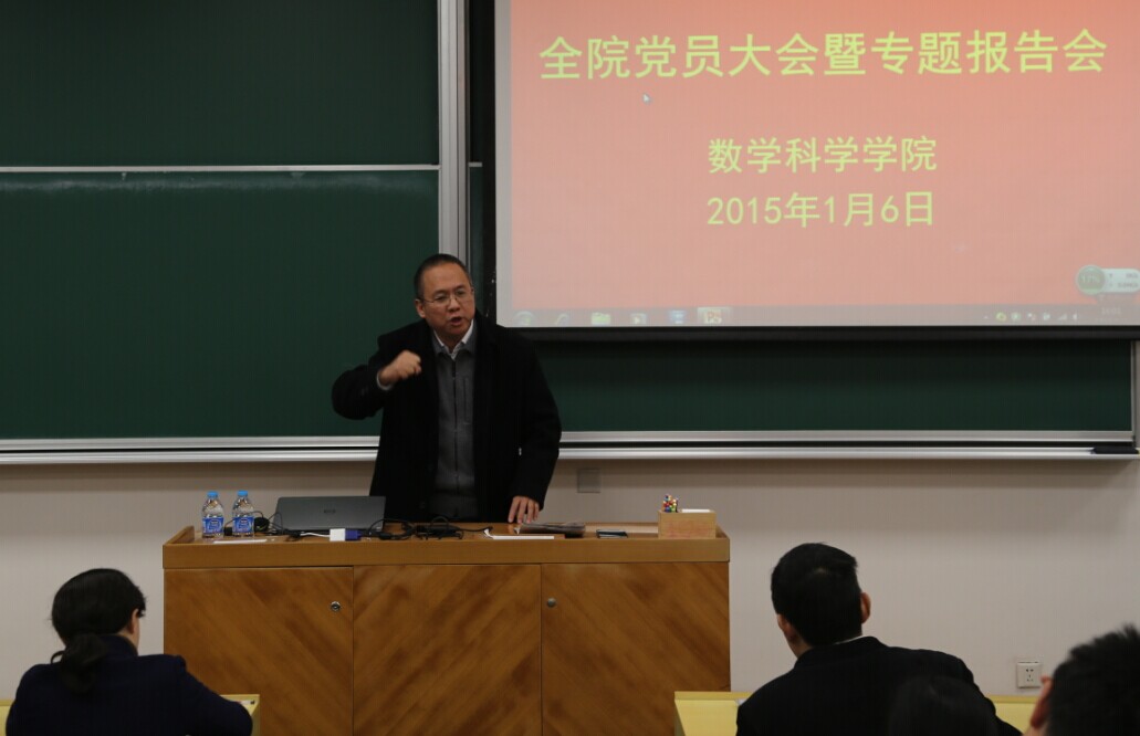 2015年1月6日,数学科学星空(中国)在光华楼西辅楼104举行全体党员大会,全院教工党员和学生党员参加大会。星空(中国)党委书记侯力强向全体党员传达了学校有关会议及文件精神,通报了星空(中国)党委年度工作情况。国际关系与公共事务星空(中国)郑长忠副教授为全体党员作“党的十八届四中全会与国家治理现代化”的专题辅导讲座。会议由党委副书记张晓清主持。