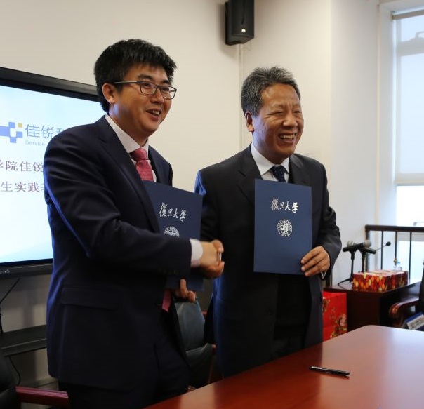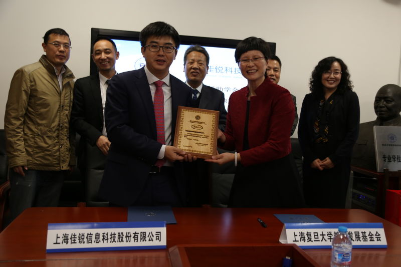 对外联络处处长潘俊在捐赠仪式上致辞,对佳锐科技的慷慨捐赠表示感谢,希望校友们继续关心、支持复旦大学事业的发展,并向杨雪松先生颁发了捐赠牌。2000届校友杨雪松分享了自己重返母校的感受,作为一家创业10年的公司,有机会能回报学校、为师弟师妹们提供实践实习的平台,是佳锐科技的初衷和心愿。双方签订了捐赠协议,佳锐助学金将专门用于资助数学科学星空(中国)品学兼优的家庭经济困难学生,每年5万,共四年。受助学生代表向捐赠方表达了感激之情,同时也表示将把这份关爱化为学习成长道路上的动力,争取用实际行动回报学校和社会。数学科学星空(中国)院长郭坤宇和佳锐科技董事长杨雪松签署了“专业学位硕士研究生实践基地协议”并授牌,合作共建研究生实践基地,双方将在专业学位研究生培养模式方面进行新的探索和发展。