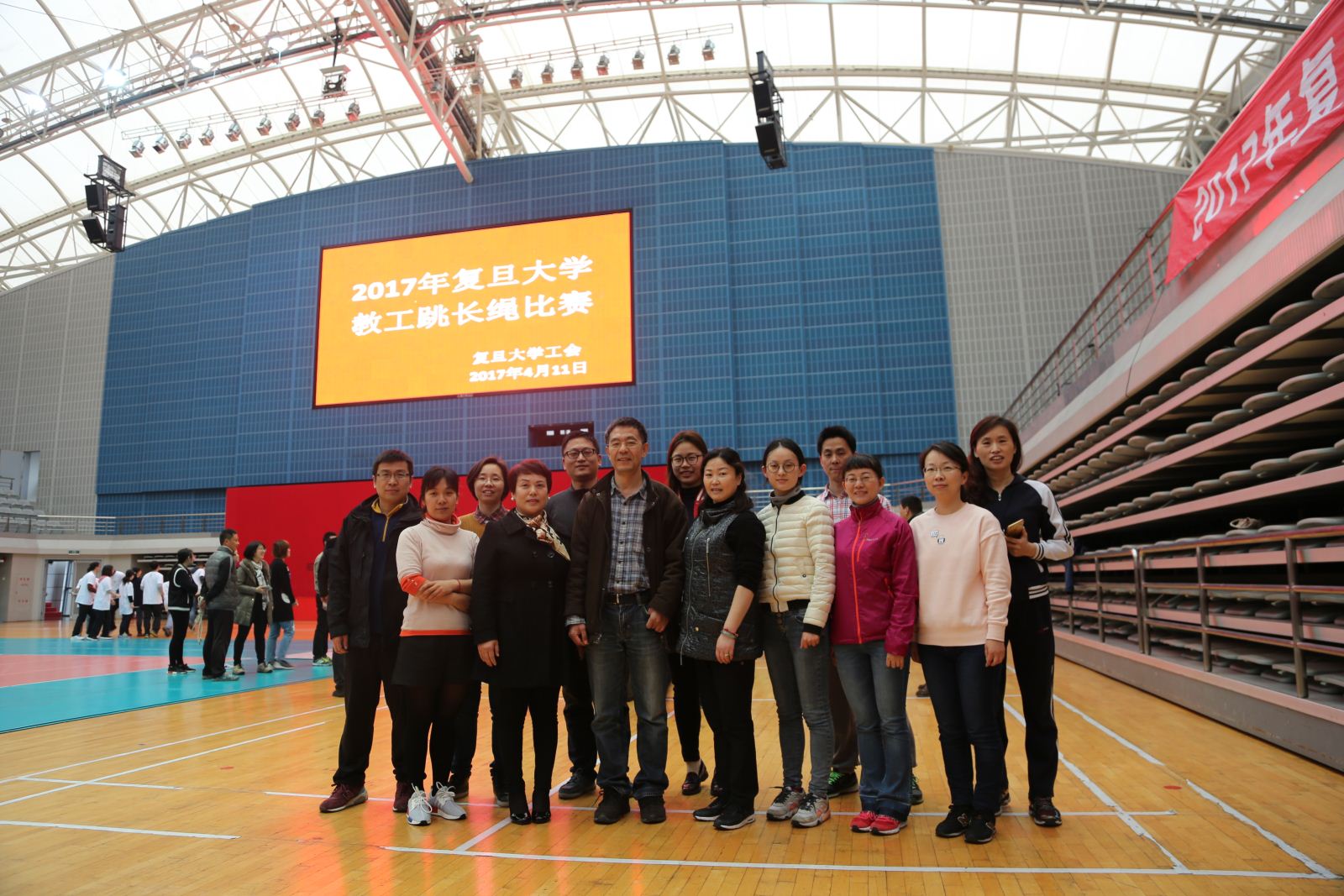 4月11日中午,2017年复旦大学教工跳长绳比赛在正大体育馆如火如荼地进行。