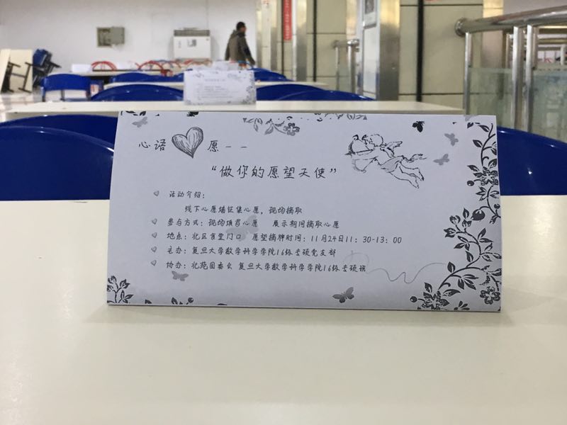 2016级专业学位研究生班组织了“直面抑郁”的主题讲座,还于27日开展了“心语心愿”主题活动。该项活动面向北苑全体研究生同学,依托北苑园委会与“复小研”微信平台进行推送,并配合横幅与宣传单的线下宣传,通过两种渠道的宣传征集北苑同学们的学习、生活心愿;活动中期在北区食堂将收集到的心愿进行展示,努力帮助心愿人找到心愿天使;活动后期将尚未实现的心愿再进行推送,在线上征集心愿天使。“心语心愿”活动通过平台的搭建,让陌生的同学之间形成以小愿望为契机的交流互动方式,舒缓了学业的压力,同时也是一次增进跨学科同学间交流的有益尝试。