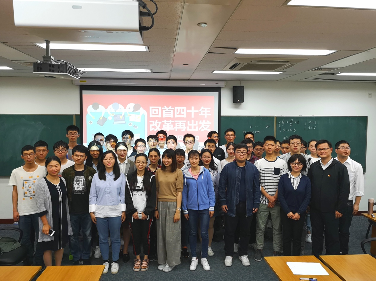 本次团日活动共分为读书交流分享与趣味知识竞赛两个环节。在前期活动中,团支部以改革开放史为背景,深入研究改革开放伟大进程,结合《邓小平文选》、《邓小平时代》、《激荡三十年》、《复兴之路》等影像、文献资料,全方位、多角度地回顾我国的改革开放史。读书分享中,邬崇正、李雨桓、杜竑毅、李欣雨等四位同学分别从“我眼中的邓小平”、“政治经济改革”、“高等教育变革”、“上海城市变革”四个方面,结合学习体会与自身经历,为团员们重绘了改革开放的宏伟蓝图。知识竞赛环节,团支委们将趣味数学题、历史文化题、党史知识题贯穿,以三个线索串成一个事件的形式,全面回顾了1978年十一届三中全会至2017年十九大关于改革开放与全面深化改革的重大历史事件,让历史的脉络变得明晰。