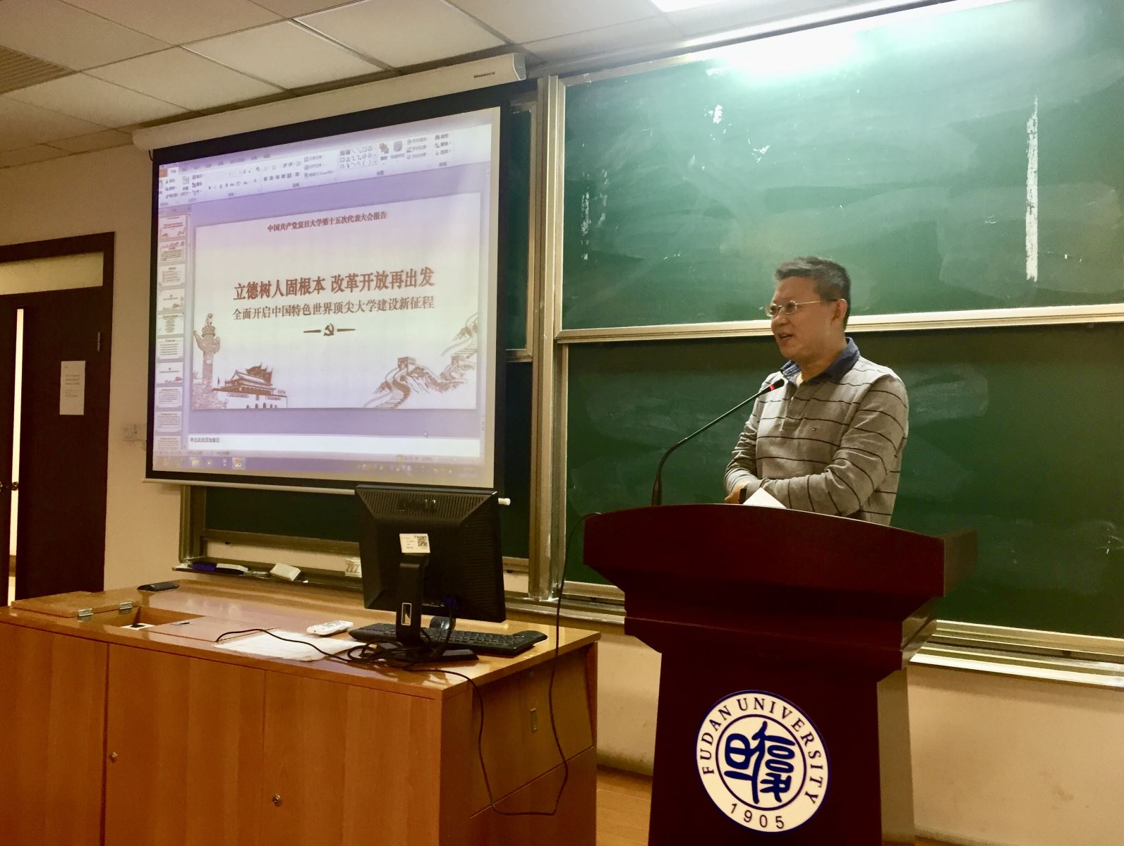随后,王永珍同志为全体教职工介绍了复旦大学第十五次党代会情况,介绍了新一届复旦大学党委会和纪律检查委员会的组成,学习传达校党委报告《立德树人固根本 改革开放再出发——全面开启中国特色世界顶尖大学建设新征程》。他在学习中指出,焦扬同志的大会报告高举中国特色社会主义伟大旗帜,深入贯彻习近平新时代中国特色社会主义思想,特别是习近平总书记关于教育的重要论述,回顾总结了学校第十四次党代会以来的工作,深入分析了学校发展所处的历史方位和时代坐标,描绘了新时代学校建设的战略目标,对未来五年学校发展的目标体系和重点任务进行了全面部署,对以一流党建和思想政治工作引领一流大学建设提出了明确要求。报告充分体现了全校上下的共同愿望。