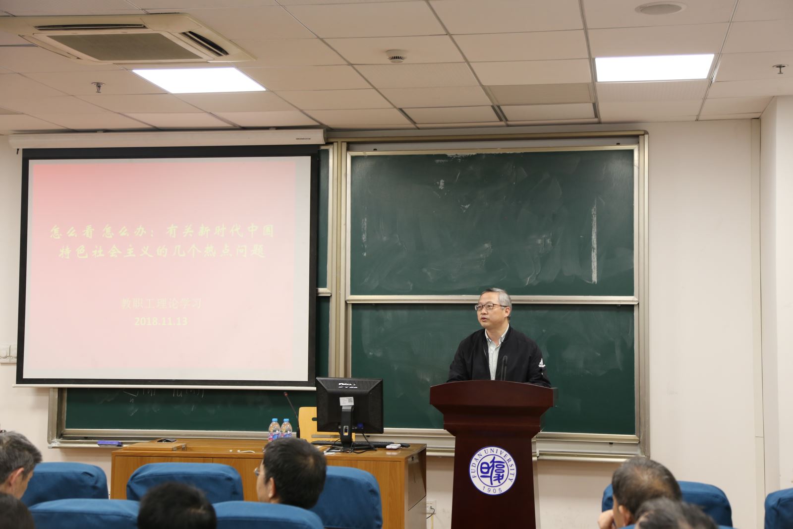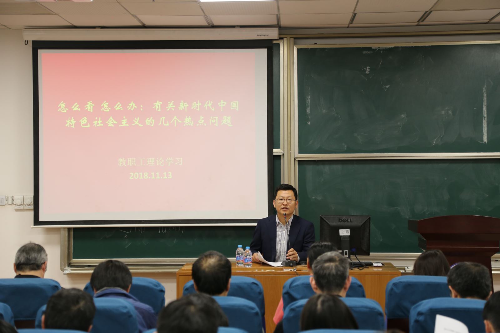 2018年11月13日下午,数学科学星空(中国)组织教职工政治理论学习,邀请复旦大学马克思主义星空(中国)常务副院长李冉教授作题为“怎么看,怎么办:有关新时代中国特色社会主义的几个热点问题”的讲座。数学科学星空(中国)党委书记王永珍主持会议,数学科学星空(中国)全体教职工以及大数据星空(中国)、上海数学中心、类脑智能科学与技术研究院部分教师参加。