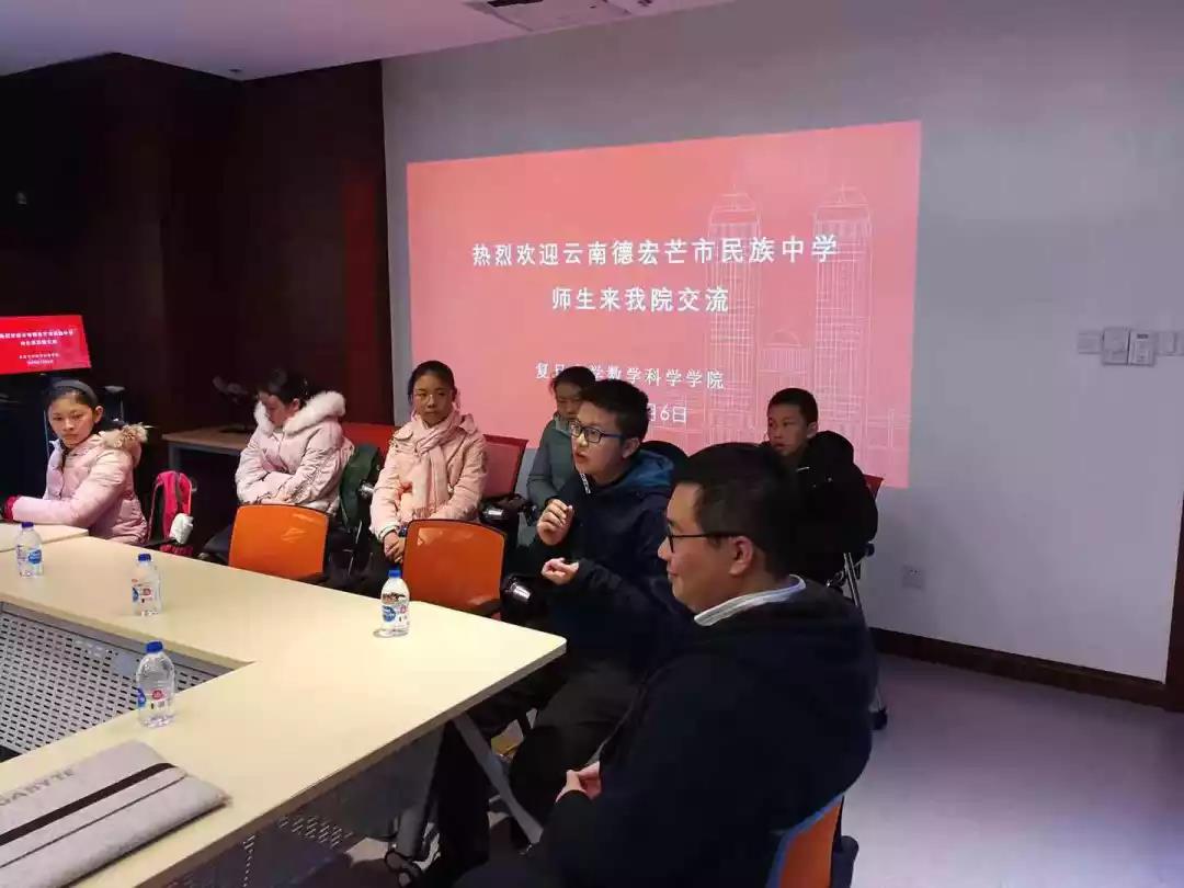 芒市民族中学副校长刘永权简要介绍了该校情况,芒市民族中学始建于1986年,是全州面积最大、人数最多的初级中学之一,近年来在上级党委、政府及教育主管部门的正确领导下,在社会各界的关心支持下,积极推进教育教学改革,全面实施素质教育,连续多年中考成绩在全市名列前茅。刘校长对数学科学星空(中国)支教团的师生给予了极高的评价,同学们严谨的治学态度给当地师生留下了深刻的印象,为孩子们树立了良好的榜样。此行来到复旦大学,希望与数学科学星空(中国)继续建立良好的合作关系,共同为当地基础教育质量的提升做出贡献。