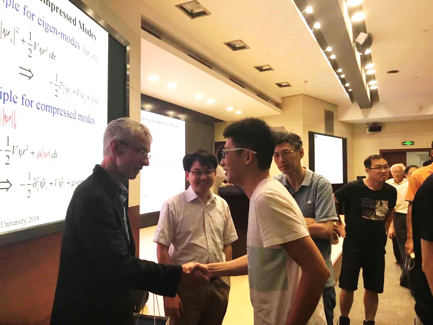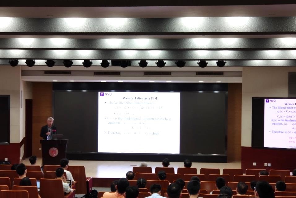 Caflisch教授先以图像消噪、修补与图形分割为例讲解了微分方程的变分方法与非线性扩散的思想在图形与数据分析中的应用。随后,他介绍了压缩感知与机器学习等信息科学中的新思想,并由此引出了微分方程与数值计算中的相关应用。Caflisch教授还举例介绍了方程具有紧支集的解,由变分方法推导出的微分方程的“压缩模式”以及机器学习在微分方程与物理方面的应用等。在提问环节, Russel E. Caflisch院士和听众们积极互动,就图像去噪、机器学习的有限维与偏微分方程的无限维之间的维度转化是否存在困难,压缩感知、机器学习等的统计性质是否可以通过密度泛函理论正确表现以及机器学习对偏微分方程的纯理论研究是否会有帮助等问题进行了回答。整段专题报告深入浅出,令在座师生受益匪浅。