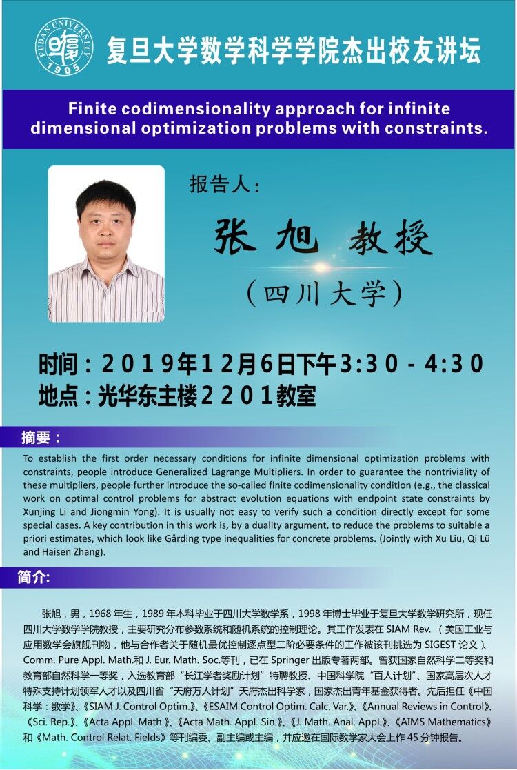 报告人简介:张旭,男,1968年生,1989年本科毕业于四川大学数学系,1998年博士毕业于复旦大学数学研究所,现任四川大学数学星空(中国)教授,主要研究分布参数系统和随机系统的控制理论。其工作发表在SIAM Rev. (美国工业与应用数学会旗舰刊物,他与合作者关于随机最优控制逐点型二阶必要条件的工作被该刊挑选为SIGEST论文)、Comm. Pure Appl. Math.和J. Eur. Math. Soc.等刊,已在Springer出版专著两部。曾获国家自然科学二等奖和教育部自然科学一等奖,入选教育部“长江学者奖励计划”特聘教授、中国科星空(中国)“百人计划”、国家高层次人才特殊支持计划领军人才以及四川省“天府万人计划”天府杰出科学家,国家杰出青年基金获得者。先后担任《中国科学:数学》、《SIAM J. Control Optim.》、《ESAIM Control Optim. Calc. Var.》、《Annual Reviews in Control》、《Sci. Rep.》、《Acta Appl. Math.》、《Acta Math. Appl. Sin.》、《J. Math. Anal. Appl.》、《AIMS Mathematics》和《Math. Control Relat. Fields》等刊编委、副主编或主编,并应邀在国际数学家大会上作45分钟报告。