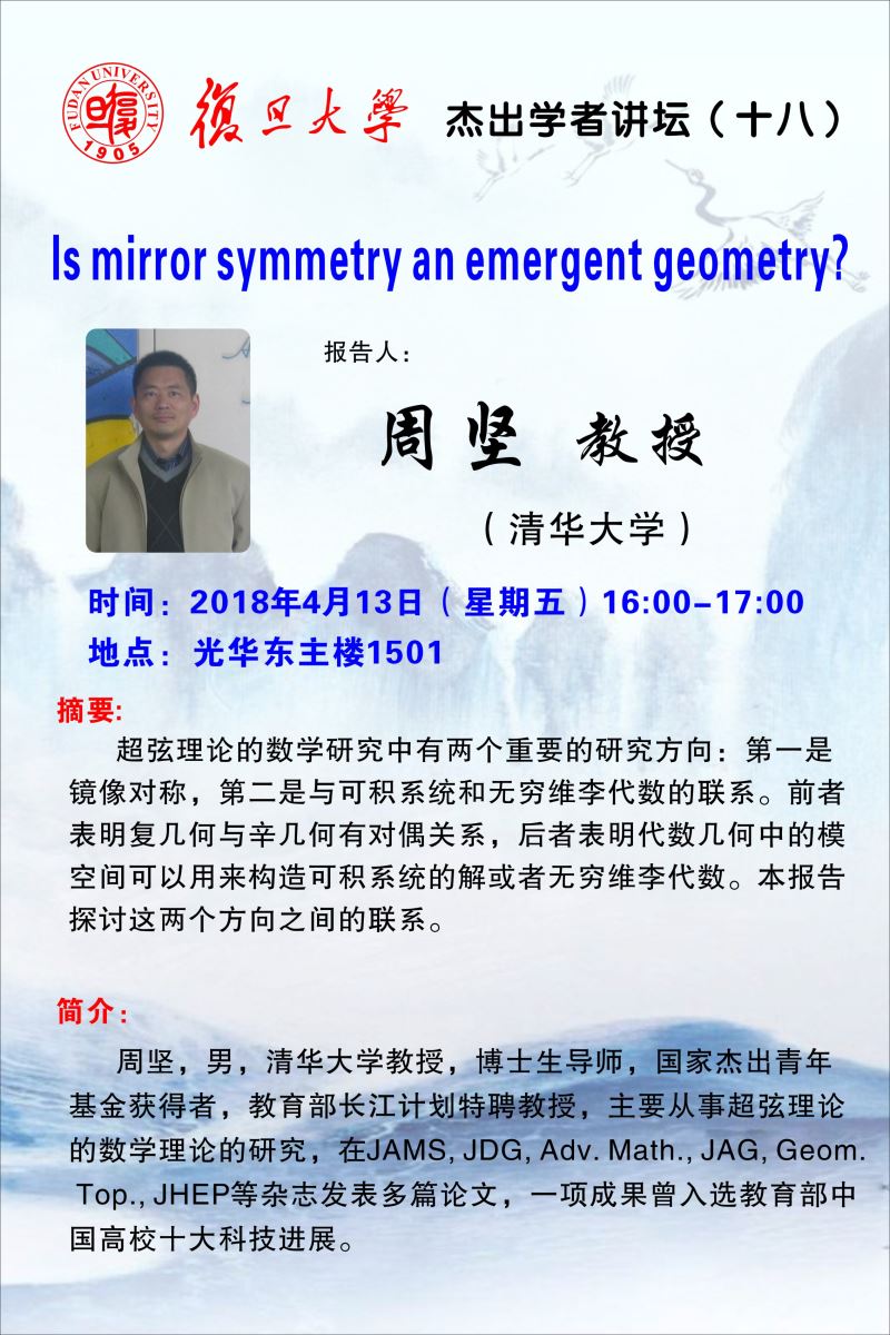 | Presentation Name: | 杰出学者讲坛(十八):Is mirror symmetry an emergent geometry? |