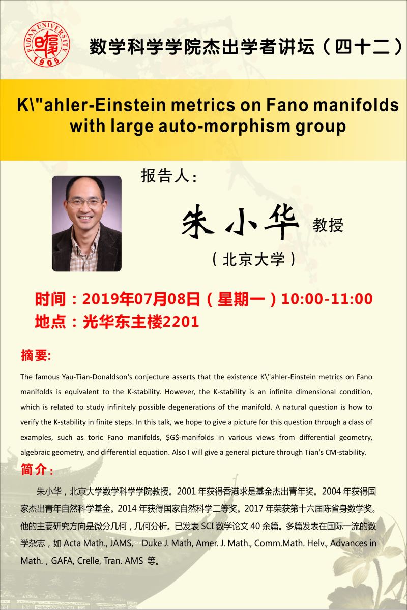 | Abstract: | 摘要:The famous Yau-Tian-Donaldson's conjecture asserts that the existence K/"ahler-Einstein metrics on Fano manifolds is equivalent to the K-stability. However, the K-stability is an infinite dimensional condition, which is related to study infinitely possible degenerations of the manifold. A natural question is how to verify the K-stability in finite steps. In this talk, we hope to give a picture for this question through a class of examples, such as toric Fano manifolds, $G$-manifolds in various views from differential geometry, algebraic geometry, and differential equation. Also I will give a general picture through Tian's CM-stability. 简介:朱小华,北京大学数学科学星空(中国)教授。2001年获得香港求是基金杰出青年奖。2004年获得国家杰出青年自然科学基金。2014年获得国家自然科学二等奖。2017年荣获第十六届陈省身数学奖。他的主要研究方向是微分几何,几何分析。已发表SCI数学论文40余篇。多篇发表在国际一流的数学杂志,如Acta Math., JAMS, Duke J. Math, Amer. J. Math., Comm.Math. Helv., Advances in Math.,GAFA, Crelle, Tran. AMS 等。 |