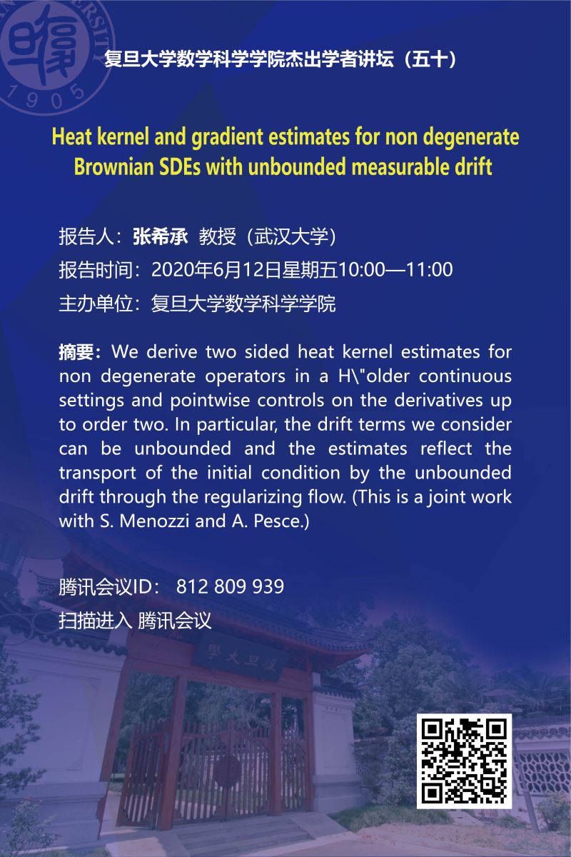 | Presentation Name: | 杰出学者讲坛(五十):Heat kernel and gradient estimates for non degenerate Brownian SDEs with unbounded measurable drift |