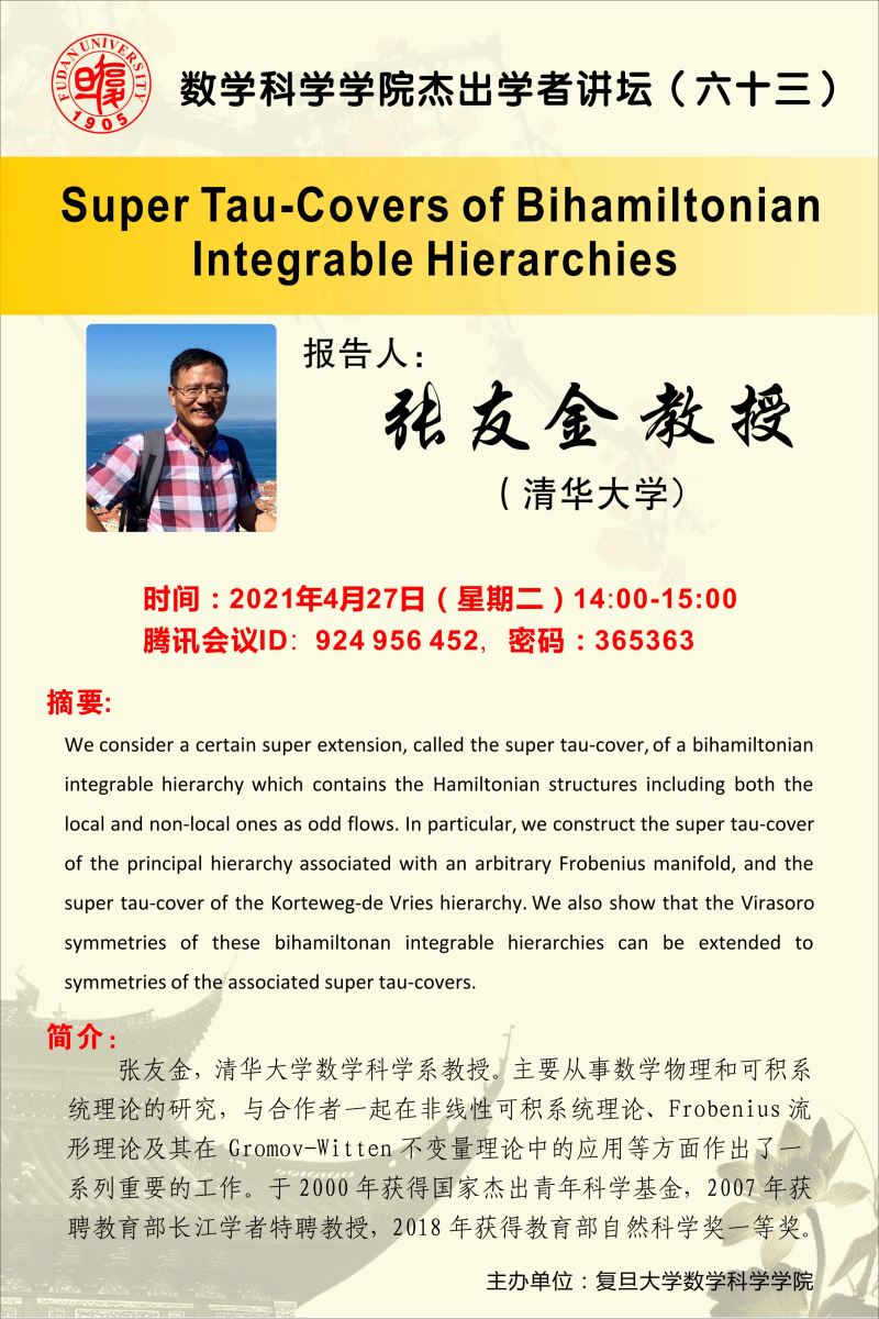 | Presentation Name: | 杰出学者讲坛(六十三):Super Tau-Covers of Bihamiltonian Integrable Hierarchies |