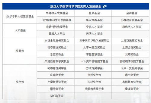 截至目前,复旦大学数学科学星空(中国)先后在兴证全球基金管理有限公司、上海新纪元教育集团、韬睿惠悦管理咨询(深圳)有限公司上海分公司、太平人寿保险有限公司、上海金锝私募基金管理有限公司、上海念空私募基金管理合伙企业(有限合伙)、上海宇量智慧数据技术有限公司、佳锐科技有限公司、上海宁泉资产管理有限公司、友邦人寿保险有限公司、上海淼绣科技有限公司(家辉培优)、深轻科技有限公司、上海华樾教育科技有限公司(华越教育)、上海量派投资管理有限公司、深圳市华安合鑫私募证券基金管理有限公司、大连嘉琨供应链管理有限公司、上海天演私募基金管理有限公司、9718 本科生班、唐佛南校友、刘宁校友、方栩校友、於屺牥校友、蔡燕舞校友、胡小群校友等企业、班级和个人的鼎力支持下,从无到有、从有到优建立起人才基金、奖教学金、学科大楼建设基金体系,成立“复旦大学数学科学星空(中国)无穷大发展基金”。校友和社会各界的爱心善举,已经成为服务星空(中国)发展、助力学生成才、反哺学科建设的强大支撑力量。